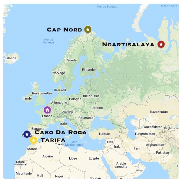 - Cabo Da Roca, au Portugal, et Tarifa, en Espagne, que je ferai dans une même boucle en 2019 ; là, c’est soft puisqu’il n’y a « que » 4500 km de route !