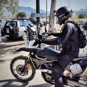 Je n’ai toujours pas compris pourquoi (je crois vraiment qu’il a perdu un pari mais qu’il ne veut pas l’avouer…), mais il s’est inscrit au Hellas Rally avec une 125… Une Honda SLX… Des années 80…