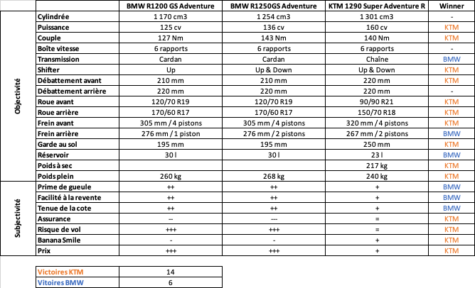 Alors voilà, le résultat est sans appel ! 14 à 6 pour la KTM 1290 Super Adventure R vs BMW R 1200 GS Adventure ! C’est un KO pour la BMW ! Mais au final, tu veux que je te dise ce qui m’a décidé définitivement ? Le petit truc qui te fait passer la frontière et quitter l’Allemagne pour aller en Autriche ? C’est ces 3 raisons :