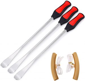 Le plus important, c’est d’y aller petit à petit. Pour t’aider, tu pulvérises du savon liquide sur tout le bord de la jante… Ensuite, tu décolles le pneu de la jante, tu mets la protection de jante, et tu glisses la cuillère. Tu fais la même chose à 20cm, et tu lèves tranquillement les 2 en faisant levier avec la jante. Normalement, le pneu va sortir. Tu fais ça autant que nécessaire pour le sortir totalement.