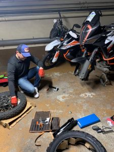 Des pneus, j’en ai changé des dizaines sur mes vélos ! Alors là, ils sont un peu plus gros, les écrous sont un peu plus gros aussi, MAIS, ils n’ont pas de chambre à air ! Je suis gagnant non ? Tout ça va être trop facile, donc je me rajoute un petit challenge en plus : faire ça uniquement avec les outils livrés avec la moto.