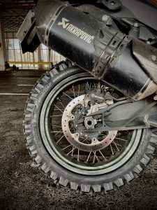 Ensuite, tu dévisses l’axe. Vérifie juste s’il faut (ou pas) sortir un étrier de frein pour pouvoir sortir la roue plus facilement. Par exemple, ce n’est pas utile sur ma 701. Ca passe limite sur la 1290… Mais impossible de sortir la roue avant de la DesertX sans enlever un étrier.