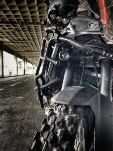 En parallèle, tu vas installer ta moto pour pouvoir la bricoler comme il faut. Si t’as une béquille centrale, c’est top, sinon, tu improvises. Dans ce cas, tu peux ajouter à la liste du matos ci-dessus une sangle basique… Je t’explique juste après pourquoi 😉