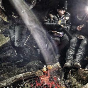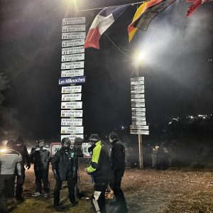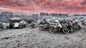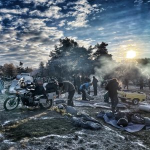 Je me refais alpaguer par la bande (désolé du coup Thierry, mais tu as mon tél et si jamais t’as besoin, t’hésite pas surtout ✌🏻), et on retourne auprès du feu avec tout ce qu’il faut pour se réchauffer (oui… t’as bien compris… l’eau n’est pas la principale boisson du weekend…) ! A chaque fois que quelqu’un passe à proximité, on a droit à un petit verre de quelque chose, une petite rasade, une buche pour alimenter le foyer, et… des histoires de moto…