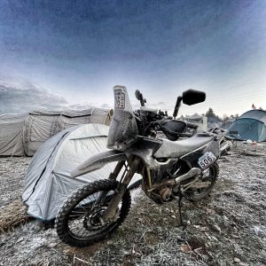 Déjà , prévois que tu auras plus froid que ce que tu imagines ! Donc prends plus d’affaires chaudes, de qualité ! Et tu peux aussi prendre une petite bâche pour ta meule. Je ne sais pas si ça t’aidera à démarrer le matin, mais au moins, tu n’auras pas de givre sur la selle 🥶