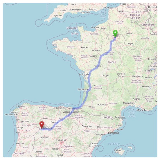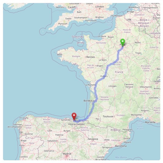 Une route bien longue (et bien ch…..) s’annonçait déjà mais c’est toujours pareil, il faut arbitrer entre le plaisir de conduire et le temps dont on dispose… Dans la mesure où mon objectif était d’en profiter à fond une fois sur place, je me suis fait violence ! J’irai à Bilbao par l’autoroute en partant de Paris ! Je dois dire que je regrette un peu l’option « Autoroute Allemande » qui m’avait quand même permis de gagner pas mal de temps en allant au Cap Nord. Avec des pointes à 250km/h aussi, ça va plus vite…