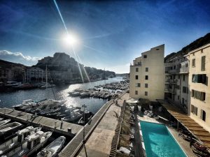 On traverse pour aller se poser et prendre un café à Macinaggio, sur la côté est et on file vers le sud pour rejoindre Bastia vers 15h30-16h et passer la nuit à l’hôtel Alivi. Chambre avec vue de ouf sur la mer, les pieds dans l’eau, et piscine ! Cerise sur le gâteau, cafetière et bouilloire dans la chambre… Que du bon !